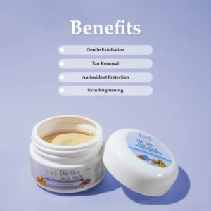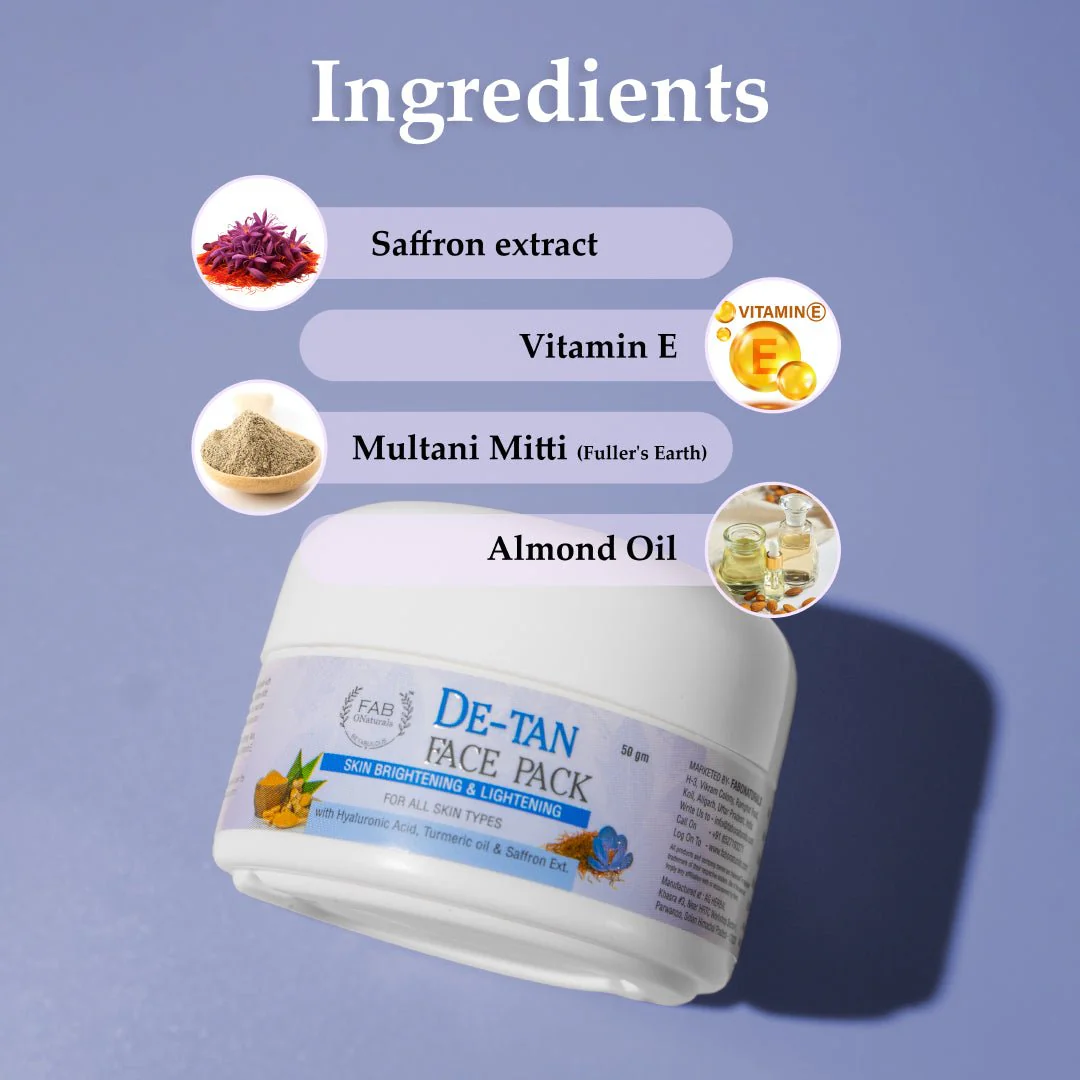 Introducing our Fabonaturals DE-Tan Face Pack, a revitalizing formula designed to gently exfoliate and brighten your complexion, leaving your skin refreshed and rejuvenated. Enriched with a nourishing blend of key ingredients, including Vitamin E, Multani Mitti (Fuller’s Earth), Almond Oil, Turmeric Oil, and Saffron Extract, this face pack offers a holistic approach to removing tan and restoring skin radiance. Vitamin E provides antioxidant protection, helping to neutralize free radicals and prevent damage caused by environmental stressors. Multani Mitti, known for its purifying properties, deeply cleanses the skin, removing impurities and excess oil while promoting a clear and glowing complexion. Almond Oil hydrates and nourishes the skin, leaving it soft, smooth, and supple. Turmeric Oil and Saffron Extract work together to brighten the skin and reduce the appearance of dark spots and pigmentation, revealing a more even and luminous complexion. Formulated for all skin types, our DE-Tan Face Pack offers a pampering experience that leaves your skin looking and feeling revitalized. Incorporate it into your skincare routine to remove tan, restore radiance, and reveal a brighter, more youthful-looking complexion with Fabonaturals.