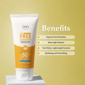 Introducing our Fabonaturals Radiant Shield Sunscreen SPF 50 PA+++, fortified with advanced blue light protection to complement its robust sun defense capabilities. Meticulously crafted to cater to the diverse needs of Indian skin types, this revolutionary formula offers unparalleled protection against both UV rays and the harmful effects of blue light emitted from digital screens. With an SPF of 50 and a high PA rating of +++, our oil-free, non-sticky sunscreen provides a lightweight and comfortable feel, perfect for daily wear. Enriched with a sophisticated blend of saffron, cucumber, and aloe vera extracts, it not only fortifies your skin’s defense but also imparts a radiant glow from within. Hyaluronic acid ensures your skin stays moisturized and supple all day long. Say goodbye to greasy residue as our sunscreen effortlessly melds into your skincare regimen, offering a seamless and luxurious experience. Elevate your sun care routine with Fabonaturals Radiant Shield Sunscreen SPF 50 PA+++, the ultimate solution for superior protection against UV and blue light, while maintaining radiant and healthy skin.